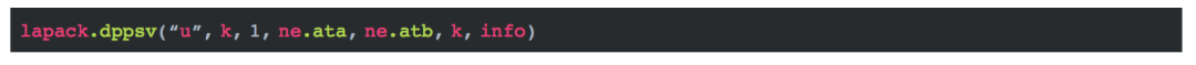 可以深入dppsv代码(Fortran代码)了解更深的细节。我们分析的重点是非负正则化最小二乘的实现,因为在某些情况下,方程组的解为负数是没有意义的。虽然方程组可以得到精确解,但却不能取负值解。在这种情况下,其非负最小二乘解比方程的精确解更有意义。``NNLS`在最优化模块会作详细讲解。