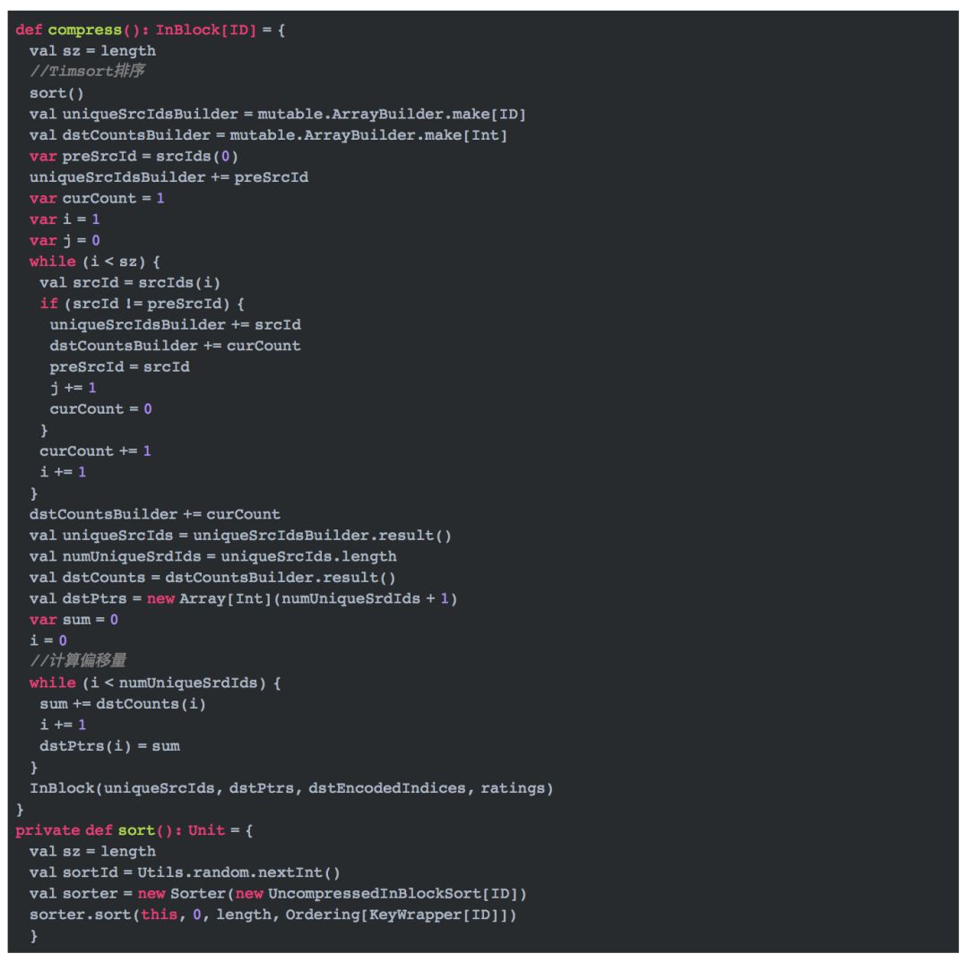 Compress方法利用spark内置的Timsort算法将UncompressedInBlock进行排序并转换为InBlock。代码如下所示: