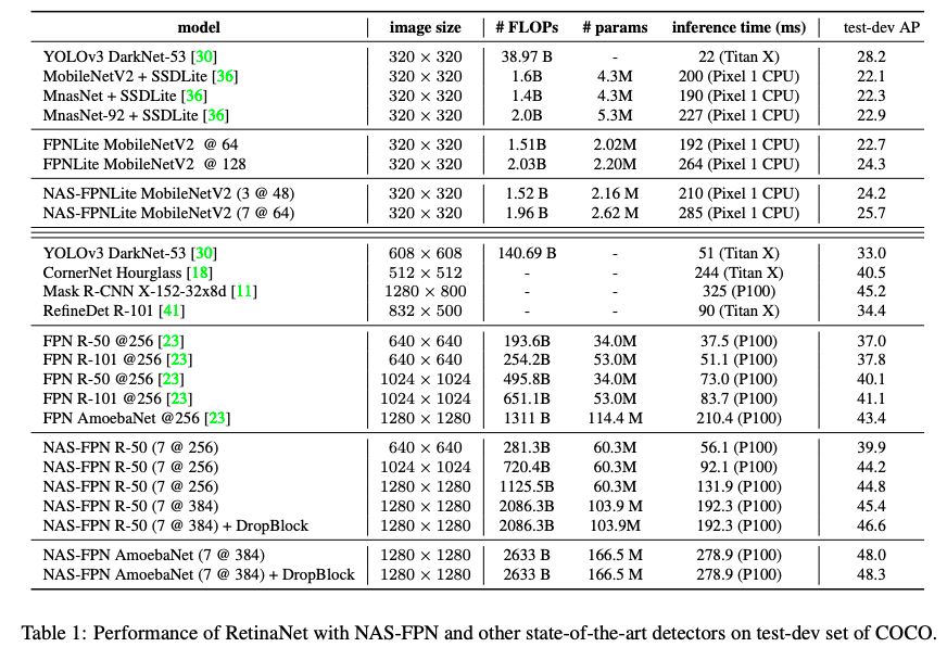 表1:使用NAS-FPN和其他最先进的检测器的RetinaNet在COCO的test-dev set上的性能比较