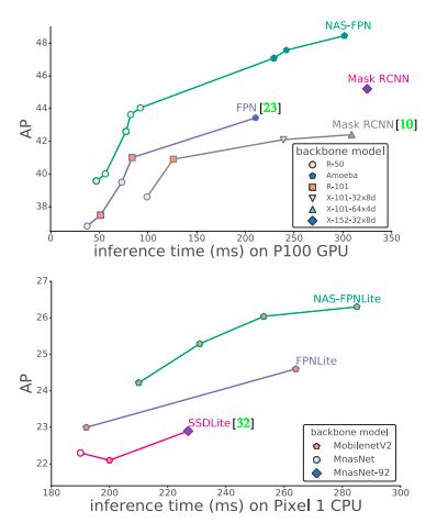 NAS-FPN的检测精度也超过了Mask R-CNN,且所需推理时间更短。