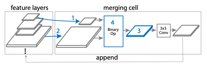 在我们的实现中,每个merging cell接受两个输入特性层(可能来自不同scale),应用处理操作,然后将它们组合起来,生成一个所需规模的输出特性层。