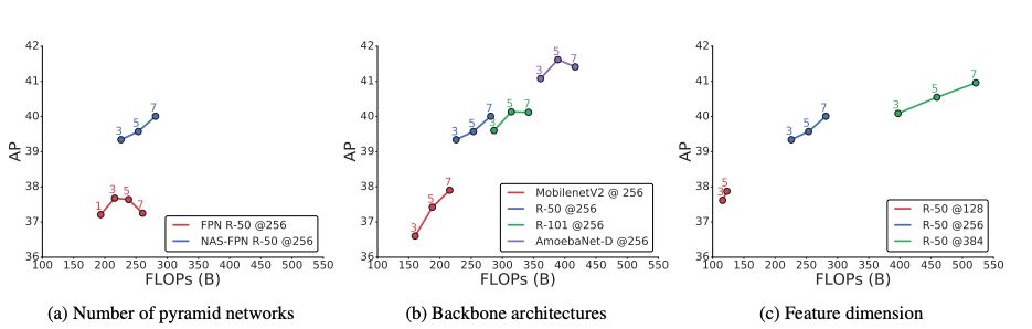 图8:通过(a)叠加金字塔网络,(b)改变主干结构,(c)增加金字塔网络的特征维数,可以控制NAS-FPN的模型容量。