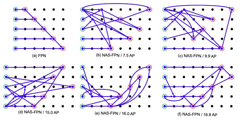 在图7(b-f)中,我们绘制了在RL训练过程中奖励逐渐提高的NAS-FPN架构。