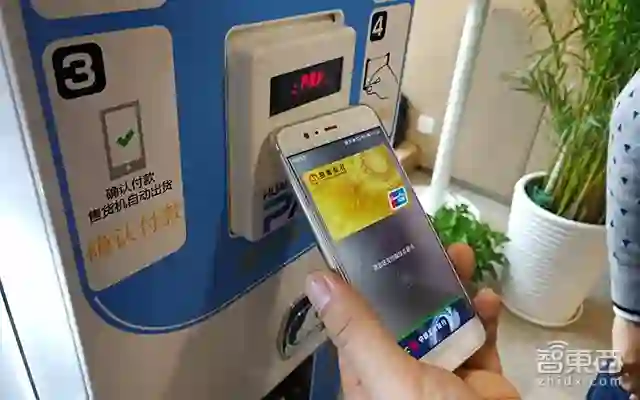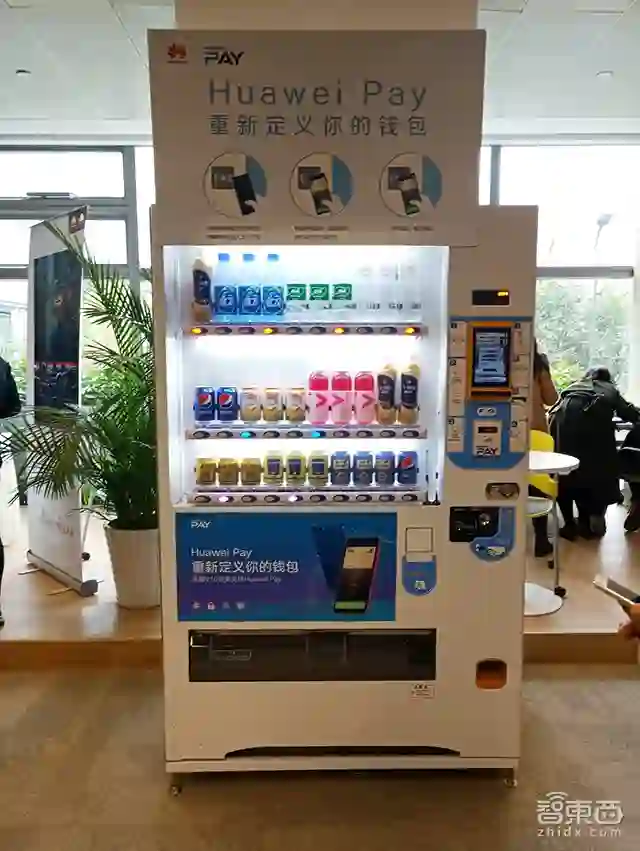 在现场,智东西也在一台饮料自动贩卖机上亲身体验了Huawei Pay。通过NFC技术,用户可以将信用卡绑定到自己的华为手机里,进行“一触闪付”。