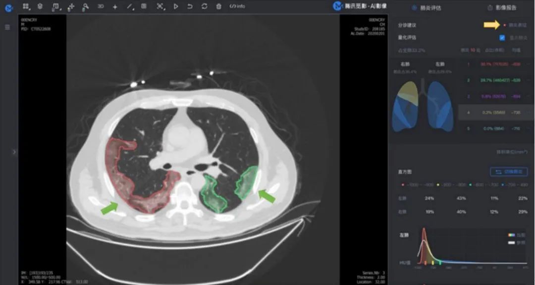 腾讯觅影《肺炎 CT 影像辅助分诊及评估软件》是腾讯首款获得国家药品监督管理局第三类医疗器械注册证的辅助诊断软件产品。其可用于肺部 CT 影像的显示、处理、测量和肺炎病灶识别,并不单独给出对患者的诊断意见,而是采取与人类医生结合的方式进行诊断。