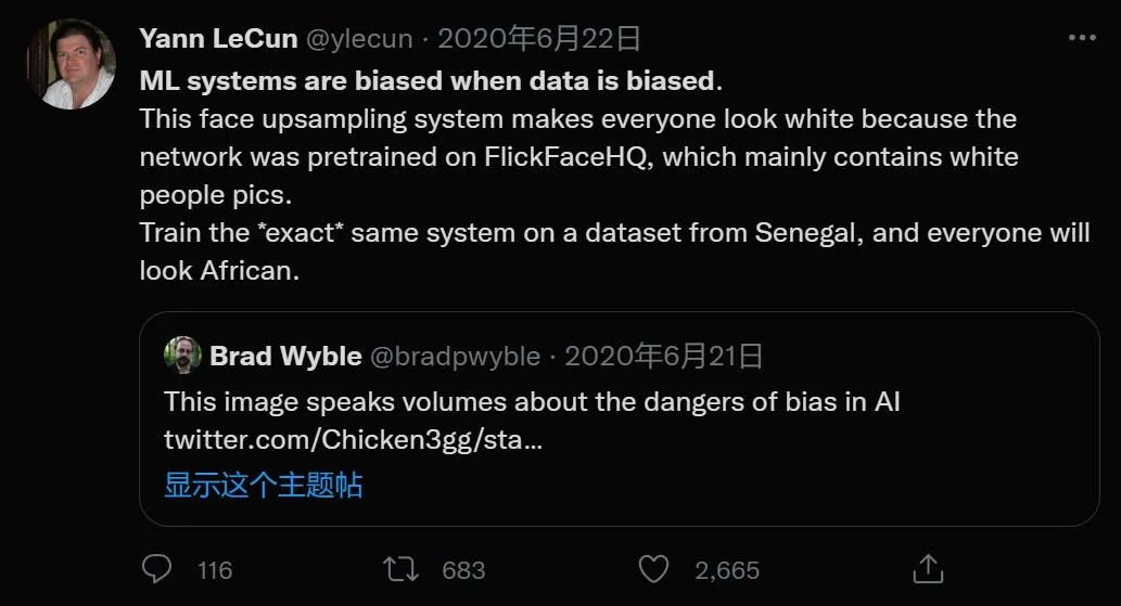 人工智能领域的先驱,图灵奖获得者 Yann LeCun 对此甚至还在社交网络上和人们论战,他先是解释为什么 PULSE 会出现这样的偏见,但并未引来普遍的认同。