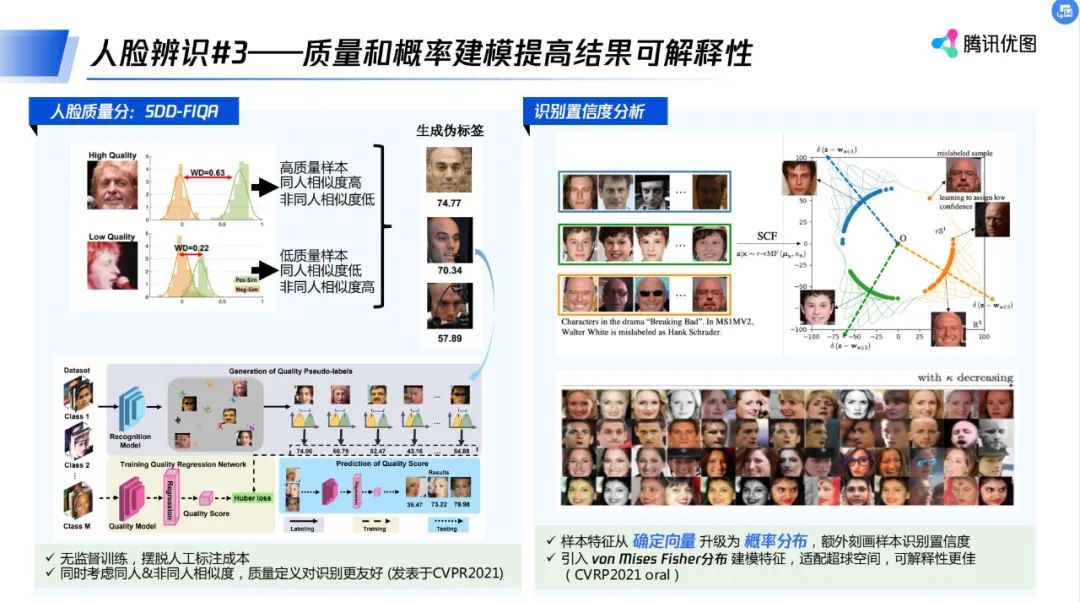 腾讯优图实验室在人脸识别任务中构建了非监督的训练方式。在验证交互过程中对图片的选择进行了优化。在特征层面上,算法又引入了冯 · 米塞斯分布来对人脸特征进行建模,将模型学到的特征表示为概率分布,在图像识别的过程中,AI 除了输出相似度之外,还可以输出自信度,为人们提供了额外的解释。