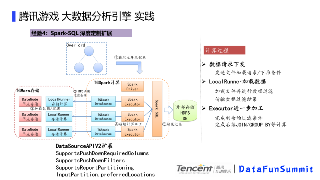 Spark-SQL深度定制扩展,主要是通过对DataSourceAPIV2扩展。计算过程包括,数据请求进行下推,本地加载文件并进行数据过滤,最后进一步加工。