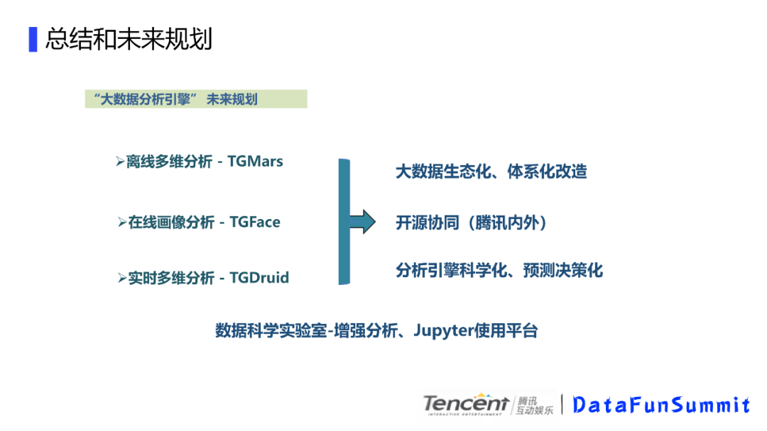 我们后续的一个规划是这样的,基于这三个引擎,我们进行大数据生态化和体系化改造,然后进行开源协同,再分析引擎科学化和预测决策化上下功夫,同时数据科学实验室部分我们目前也投入到增强分析和jupyter平台的一些开发中。希望在科学实验室上有些数据落地。