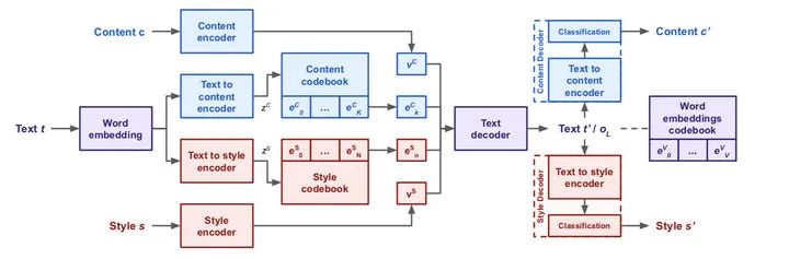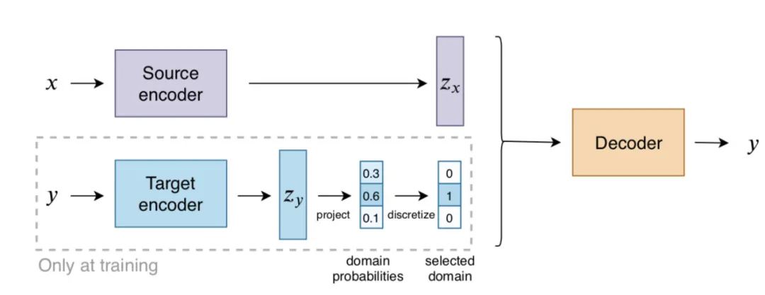 这篇工作借鉴了 discrete autoencoders 的思路,提出将一个 discrete target encoder 引入到翻译模型中,方便将每一个目标语句关联到对应的 variable 或者 domain。其中每一个 domain 对应一个 embedding,这样在测试阶段可以根据每个 domain embedding 来生成多样性的翻译。并且这种离散化的表示方式允许以无监督的方式来改变翻译的 domain 信息。