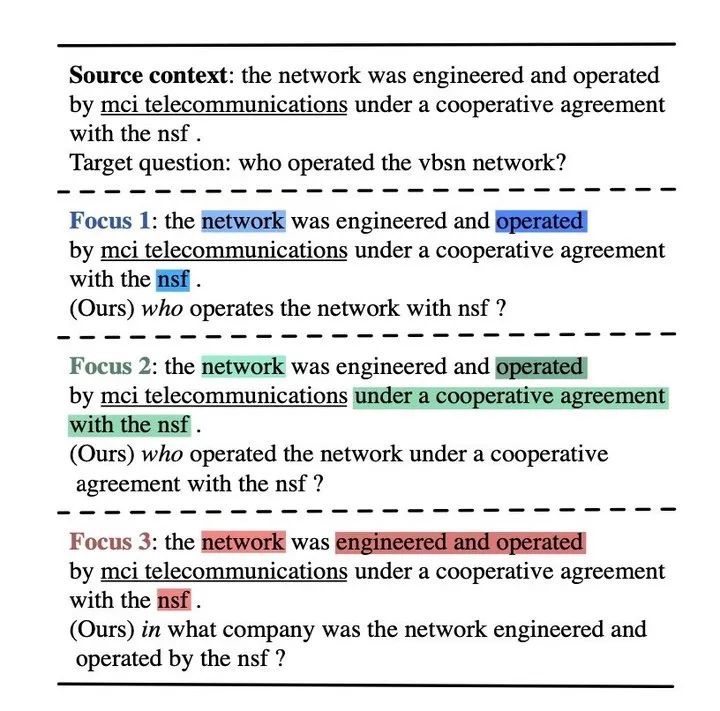 这篇论文是华为诺亚方舟收录在 EMNLP2020 的工作。主要关注的是 QA 工作的逆任务,基于回复和上下文来生成问题,同样这也在一对多生成的范畴内。本文主要思想是通过关注 context 中的不同位置以及表达的不同含义来建模多样性。