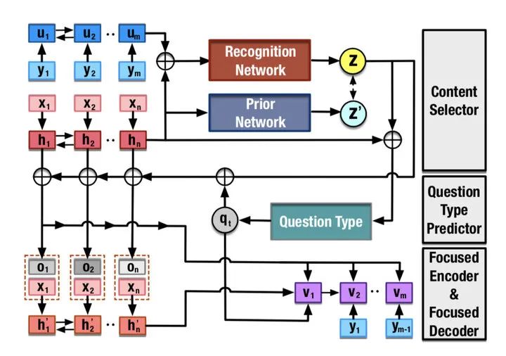 基于 CVAE,通过采用 multimodal 的先验分布来构造更多样的 content selectors,从而能够在 context 定位更多样的关注点。在预测 question type 时,提出 diversity-promoting 算法,主要通过引入 decay 变量来限制相同类型问题分布的出现概率,从而鼓励预测出更丰富的 question type。