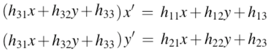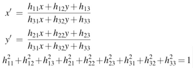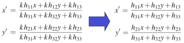 或许有人会说,9个啊,H矩阵不是9个参数吗?从h11到h33总共9个。真的是这样吗?实际上并不是,因为这里使用的是齐次坐标系,也就是说可以进行任意尺度的缩放。比如我们把hij乘以任意一个非零常数k并不改变等式结果: