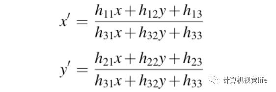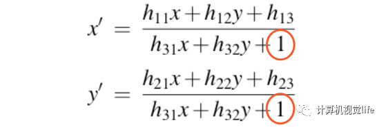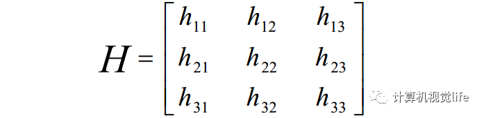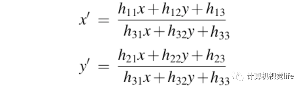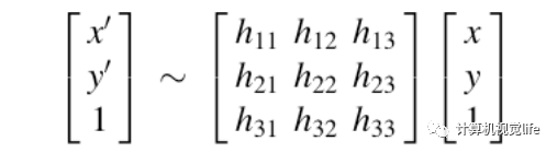 了解了上述单应性的部分应用后,我们就有很大的动力来学习单应矩阵的推导和计算了。首先,我们假设两张图像中的对应点对齐次坐标为(x',y',1)和(x,y,1),单应矩阵H定义为: