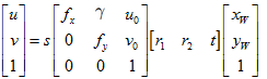 其中,u、v表示像素坐标系中的坐标,s表示尺度因子,fx、fy、u0、v0、γ(由于制造误差产生的两个坐标轴偏斜参数,通常很小)表示5个相机内参,R,t表示相机外参,Xw、Yw、Zw(假设标定棋盘位于世界坐标系中Zw=0的平面)表示世界坐标系中的坐标。