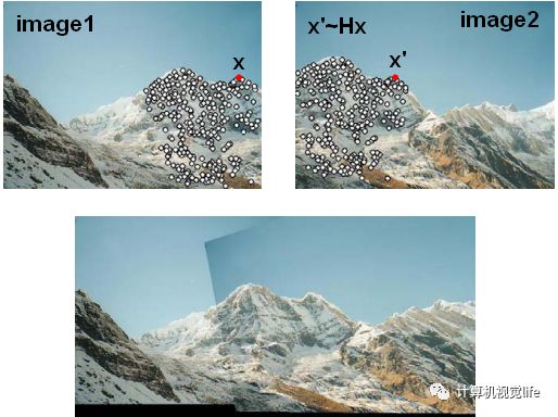 既然单应矩阵可以进行视角转换,那我们把不同角度拍摄的图像都转换到同样的视角下,就可以实现图像拼接了。如下图所示,通过单应矩阵H可以将image1和image2都变换到同一个平面。