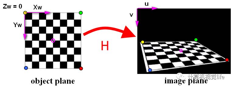 经过前面一系列的介绍,我们应该大致明白如何根据打印的棋盘标定图和拍摄的照片来计算单应矩阵H。我们来总结一下大致过程。