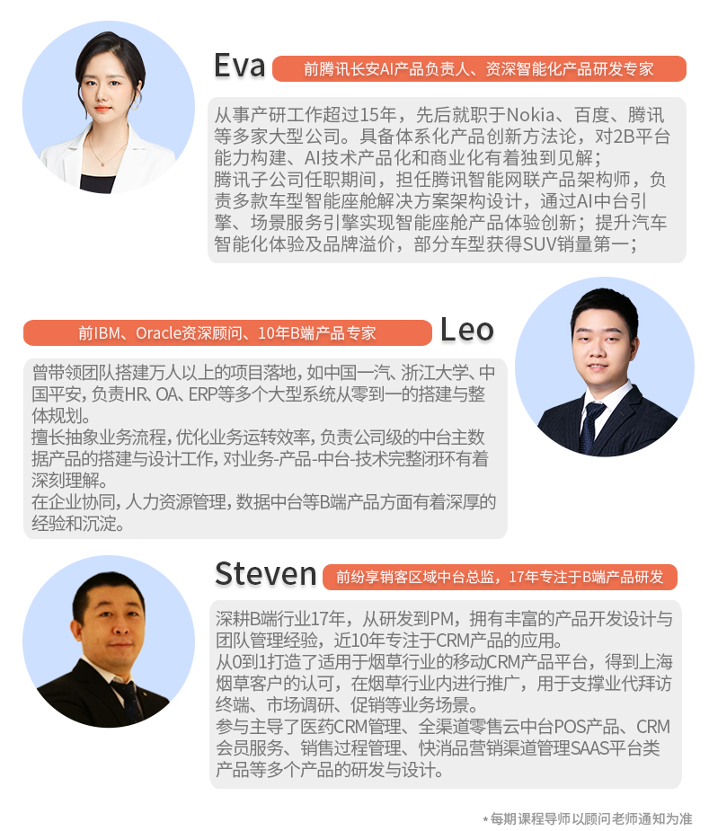 于是,我们在一线互联网公司产品专家/总监以上职位,且有操盘过丰富大体量项目的候选导师中,不断筛选、寻找最合适的人选。