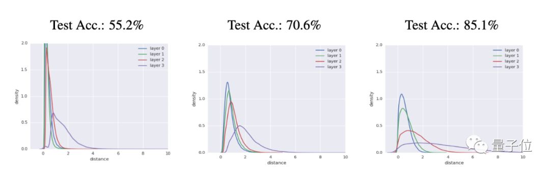 y轴表示归一化边缘分布(x轴)在模型的4层网络中的概率密度,很显然,边缘分布和测试准确率具有很强的关联性。