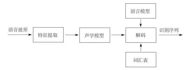 所谓语音识别,就是将一段语音信号转换成相对应的文本信息,系统主要包含特征提取、声学模型,语言模型以及字典与解码四大部分,其中为了更有效地提取特征往往还需要对所采集到的声音信号进行滤波、分帧等预处理工作,把要分析的信号从原始信号中提取出来;之后,特征提取工作将声音信号从时域转换到频域,为声学模型提供合适的特征向量;声学模型中再根据声学特性计算每一个特征向量在声学特征上的得分;而语言模型则根据语言学相关的理论,计算该声音信号对应可能词组序列的概率;最后根据已有的字典,对词组序列进行解码,得到最后可能的文本表示。