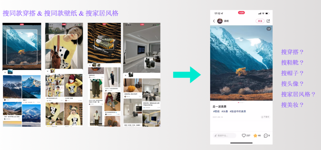 以搜索鞋子为例,小红书会关注用户的延展搜索需求,比如鞋子的不同买家秀、鞋子与不同衣服的搭配等。这样一来,图搜不再只是展示商品,更为年轻人提供了一种新的生活方式&种草平台和消费决策入口。