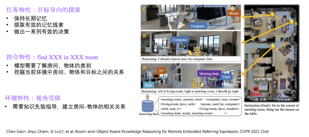 模型需要从视觉上判断哪里是客厅,哪里是办公室,并想到办公室才有鼠标。然后从视觉上判断会议桌、电脑桌,并「知道」鼠标经常和电脑放在了一起,所以优先看看电脑桌上面有没有鼠标。