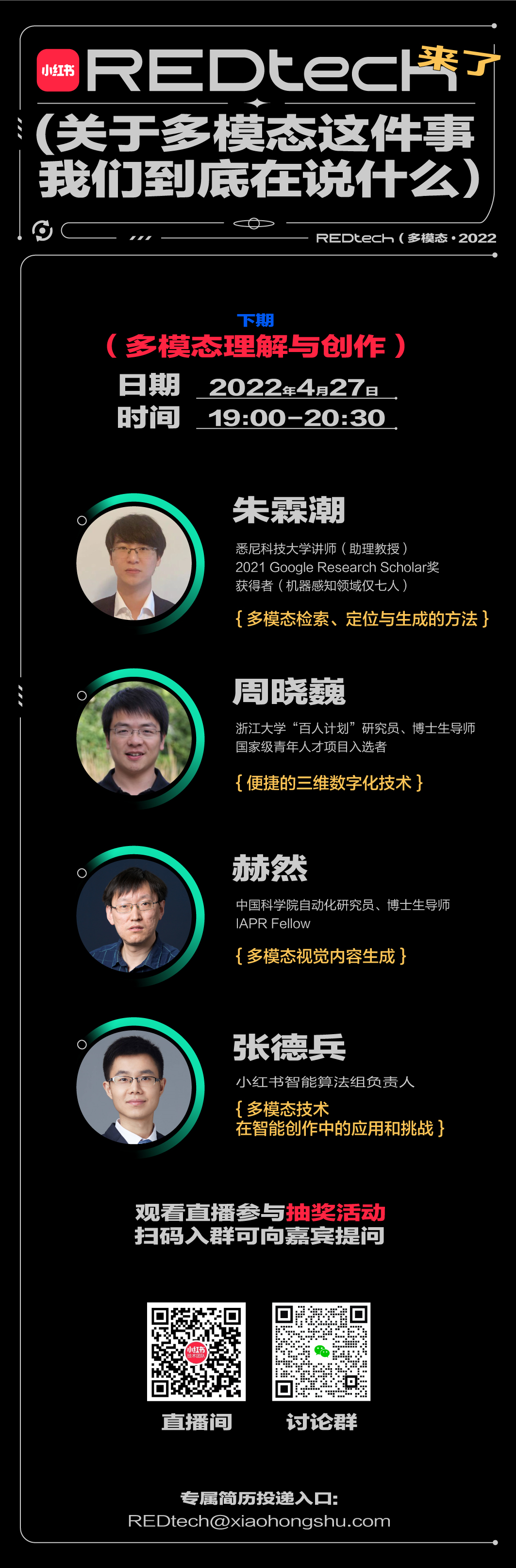 作为国内独特的以图文和短视频内容为主的社区,小红书社区每天产生海量的UGC(用户原创内容)多模态数据,这为其在产品开发和落地中采用多模态技术提供了丰富的「土壤」。4月20日,在小红书「REDtech 来了」第一期线上直播节目中,小红书技术团队联合学界几位学者大咖围绕多模态话题展开了精彩分享。