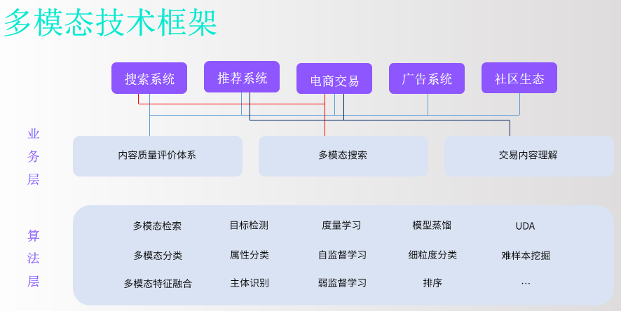 小红书多模算法组负责人汤神总结了如下多模态技术框架,在业务层面划分为内容质量评价体系、多模态搜索和交易(电商)内容理解,它们是多模态技术在内容分发场景当中最核心的三个技术栈。