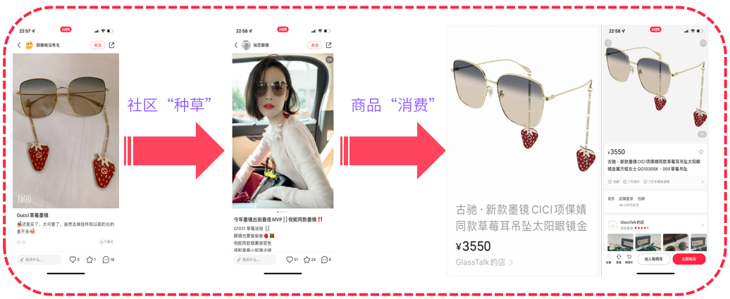 小红书对电商内容理解有着得天独厚的条件,但要利用多模态技术解决两个重要问题。其一是供货,通过用户的诉求指导整个商品消费的供给;其二是盘货,通过多模态技术在平台的视角盘点到底在卖什么以及平台当前货的调性如何。如下图所示,当在小红书 APP看到用户发了推荐某款墨镜的笔记之后,可以利用图搜进行这款墨镜的种草、消费。