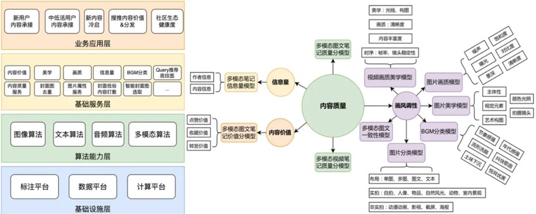 小红书建立了一套完整的内容质量评价架构,如下图左所示,这套完整的架构既具备了基础原子能力,又能快速组装满足不同业务的定制化需求。下图右展示了内容质量和画风调性模型的拆解,其中内容质量维度拆分成信息量、内容价值等,画风调性维度则拆分成画质、美学、BGM分类等模型。