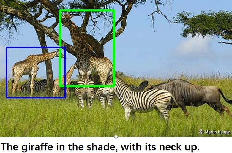 举个例子,在常规目标检测,模型能做的就是框出需要的物体,至于这个物体的位置关系、状态等等都是难以理解的。但是在视觉定位任务中,文本与图像需要相互融合,以令模型更深地理解数据。如下图给定图像和一段文本描述「在树荫下仰头站着的长颈鹿」,我们希望模型能准确找到绿框所指的长颈鹿。