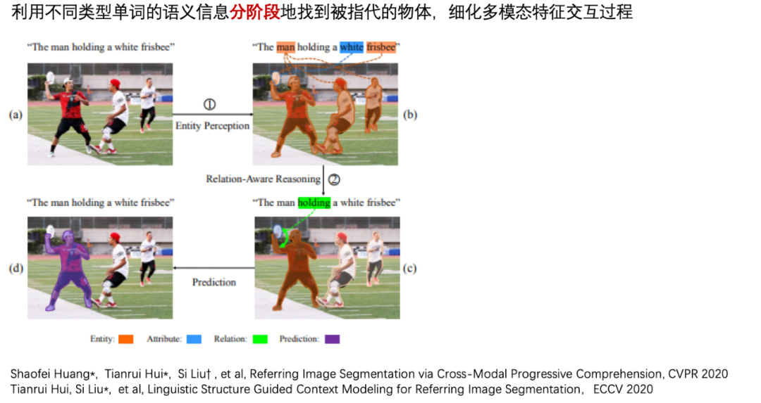 「跨模态渐进式理解模型」,先找到人,再找到白色飞盘,然后定位「holding」这个动作,最后找到了「拿着白色飞盘的人」。该方法同样通过匹配语言与视觉中的相同概念,而令模型更好地理解数据。