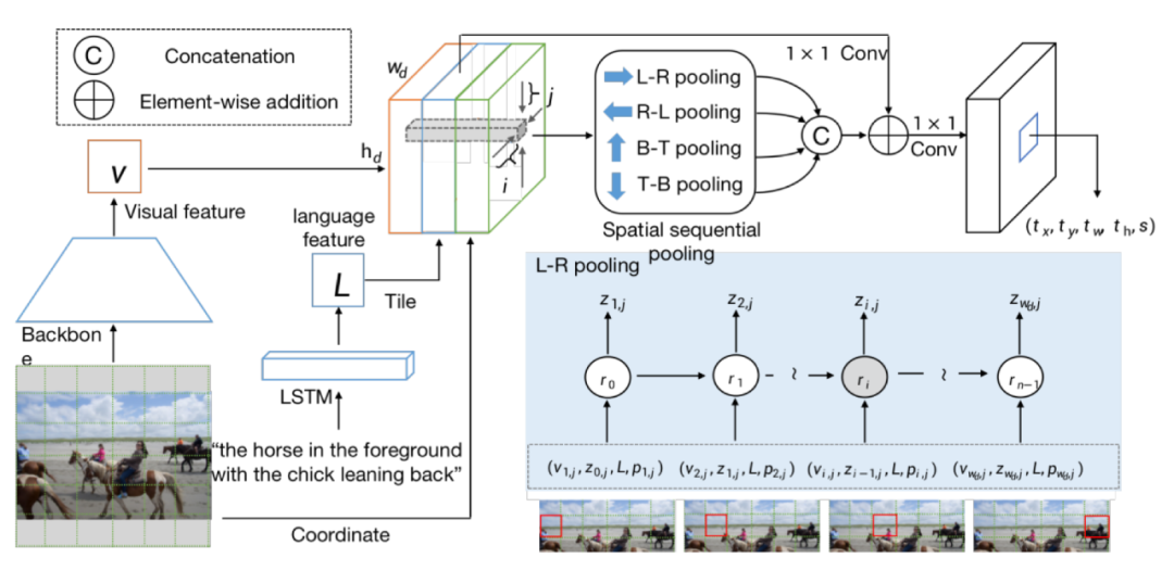 具体而言,为了融合自然语言与图像,如下图所示除了Backbone 抽取视觉信息,LSTM抽取语言信息,我们还需要为图像加上坐标(Coordinate)信息,以便于刻画物体与物体之间显式的位置关系。可以认为,下图中上下左右这四种池化操作可以作为一种桥梁,沟通了文本中关于位置的描述,以及图像中物体位置关系。即强化了文本与图像关于空间位置的「一致性」,降低了空间位置描述的「奇异性」。