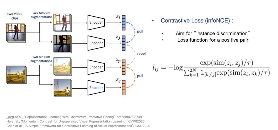 对视频片段做随机数据增强以得到 z_i 与 z_j,拉近它们的距离(pull)。同时对于不同视频片段 z_j 与 z_p,拉远它们的距离(repel)。