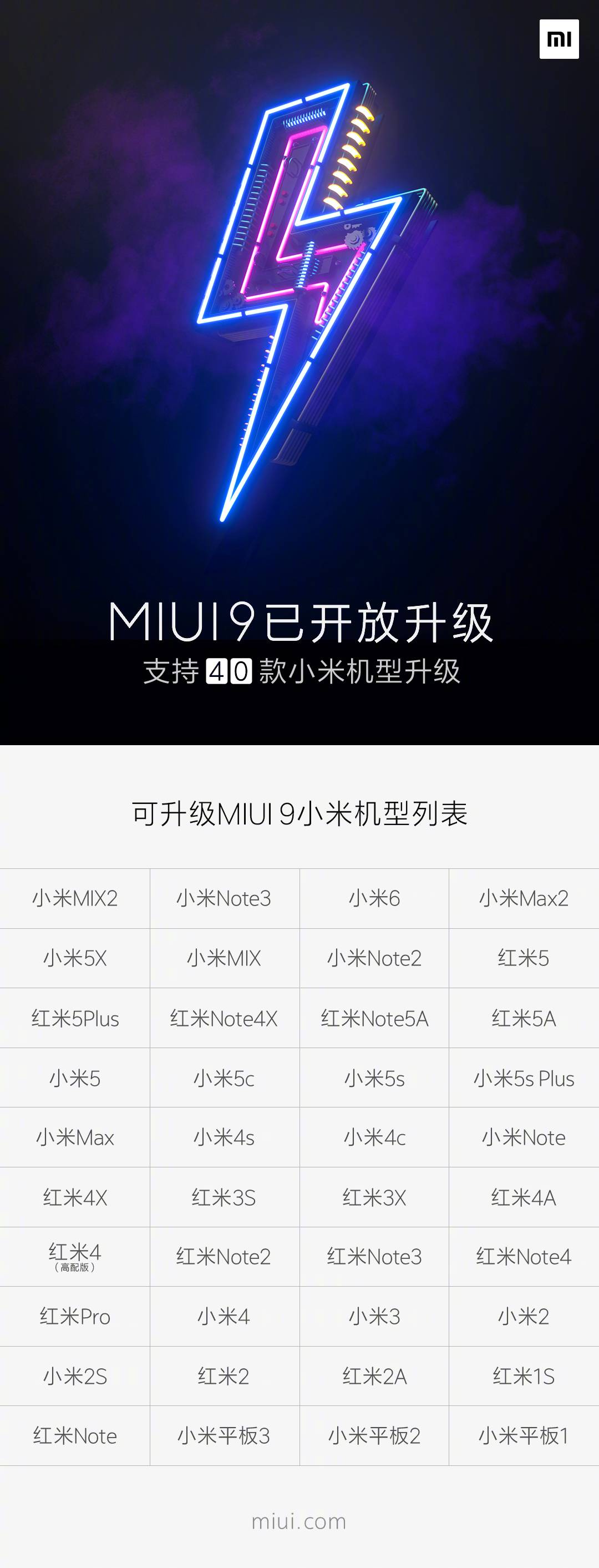 今天上午,MIUI 官方微博公布了 40 款支持最新 MIUI 9 稳定版的小米设备,除了新机型以外,小米 2、红米 1S、红米 Note 等“古董机型”也名列其中。