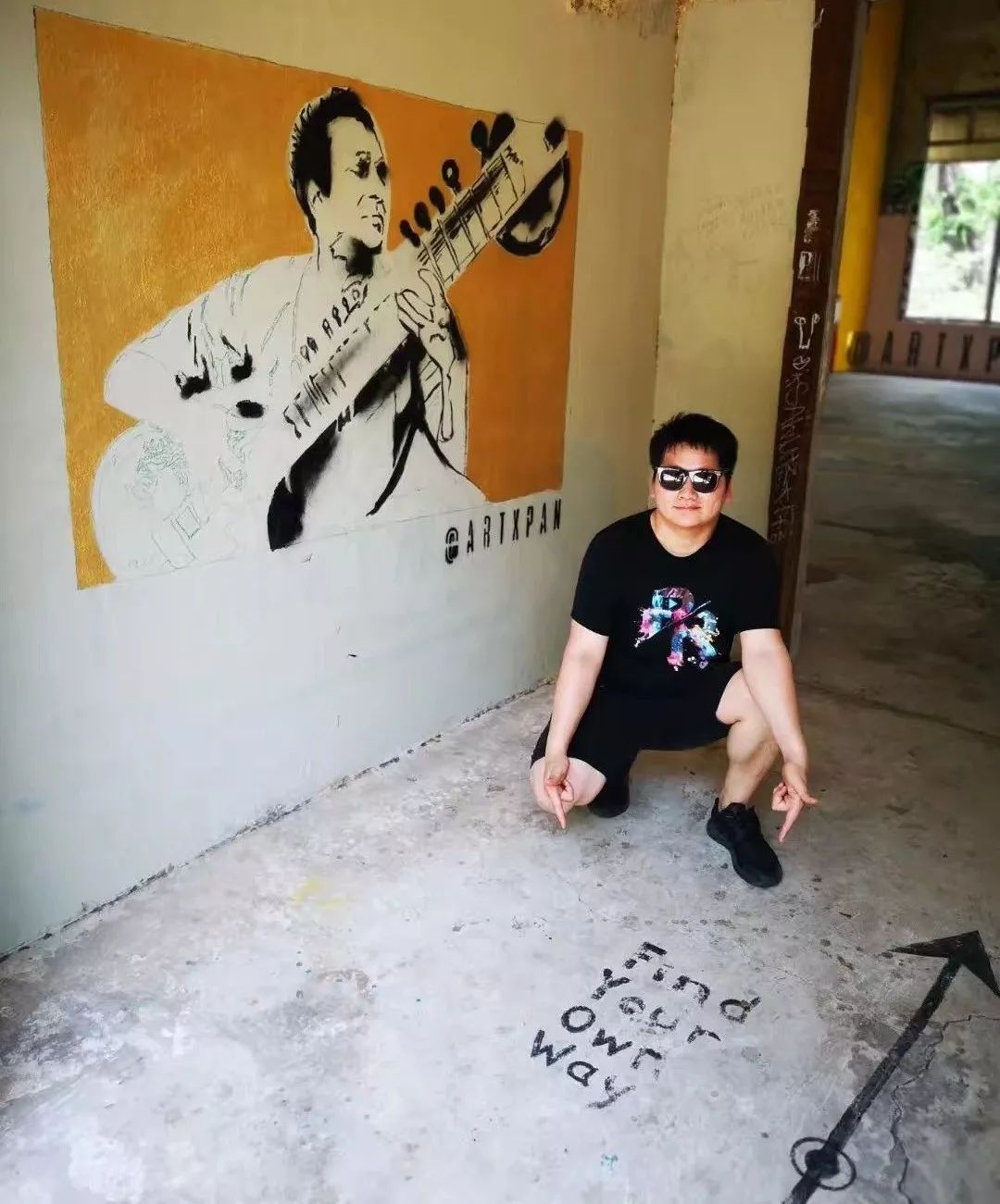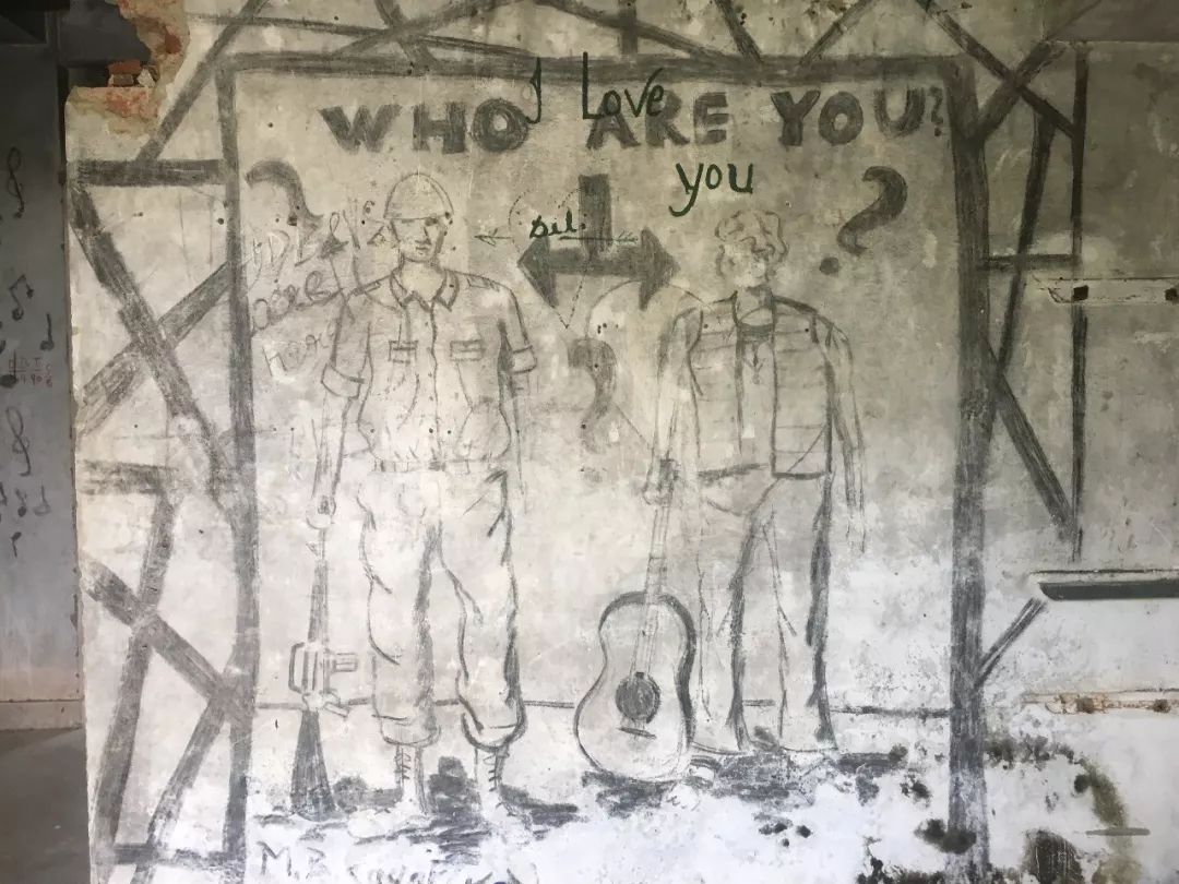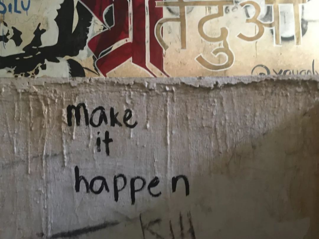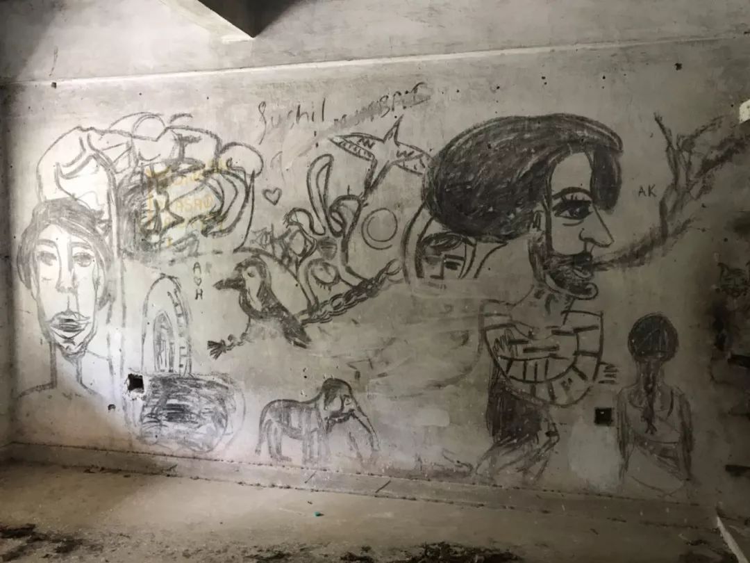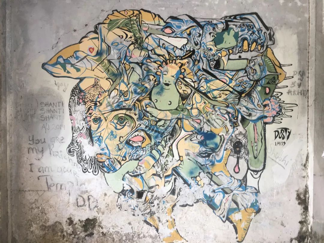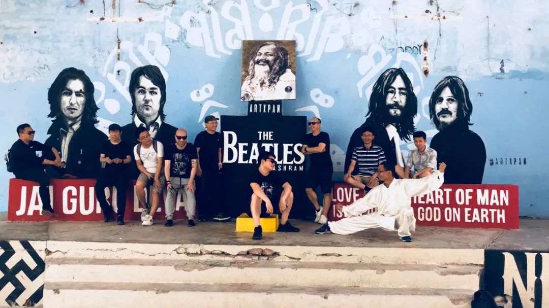 再往里走,大片的废墟掩在茂盛的草丛里,废墟墙壁斑驳,却被来自世界各地的朝圣者写满涂鸦,让人惊叹。两位年轻的印度小伙抱着吉他The Beatles的涂鸦前忘情歌唱,歌声在废墟中回荡。