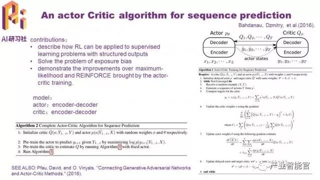 模型,actor 和 critic,一个是 decoder,一个是 encoder 的框架来形成的。actor 可以看成是输入原来的一个句子。例如,actor 的应用是应用到一个翻译上的,原来要翻译的一个句子输入成 encoder 的一个输入,decoder 输出的是翻译后的一个序列,这个序列可以输入给 critic 进行值函数的一个判断,这个值函数的判断输入在 encoder 的里面的时候是真实的.. 详细解读大家可回放公开课视频至第 47 分钟查看。