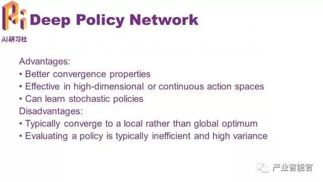 但是如果你的动作很多,或者是一个连续动作空间的话,很有可能对 GPU 消耗过大,电脑的计算能力无法承受,就会变得很低效。如果是高维或者连续型的一个空间的话,用 growth network 就可以很好解决,因为从状态到动作,直接输出的是一个动作,而不是一个价值,从价值再去映射到它的策略,映射那一部分已经被我们去掉了,如此一来,我们就可以减少大量的计算。另外,它可以学习到随机性的一个策略。