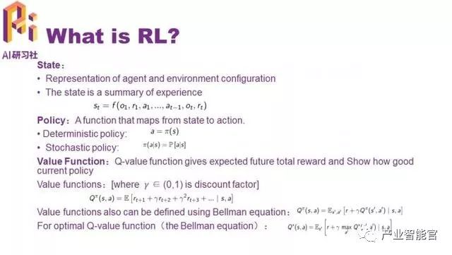下面来介绍什么是深度强化学习,以我的理解,深度强化学习指的是拟合它的策略、价值函数、模型。深度学习一般来说就是深度神经网络(其他深度树之类的不在考虑范围内),它还有个特点:利用梯度下降或者其他拟合改进之后的一个算法来拟合。现在,深度强化学习也越来越强大,不断得到发展。