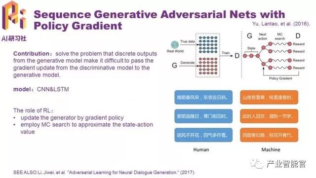 LSTM 生成一个单词,因为 CNN 这时判别不出该单词真或假的时候,它的句子很有可能不完整。LSTM 生成一个完整的句子,判别器得到这个句子之后,我们就可以把判别器当成一个信号,返回给生成器... 继强化学习之后,利用拟合的、或训练的指函数,判别器给定的一个信号,生成器去拟合,它就是利用这样的方式... 生成器生成的文本更好,效果还可以,大家可以参考它的资料复现一下。在对话方面的应用,后来做了一些改进,一开始说要生成完整的句子,用蒙特卡洛树去 sample 它就能得到一个句子,李博士也说,可以用不完整的句子让它判别,之后得到一个奖励信号去训练,具体的内容大家可以去看一下论文。