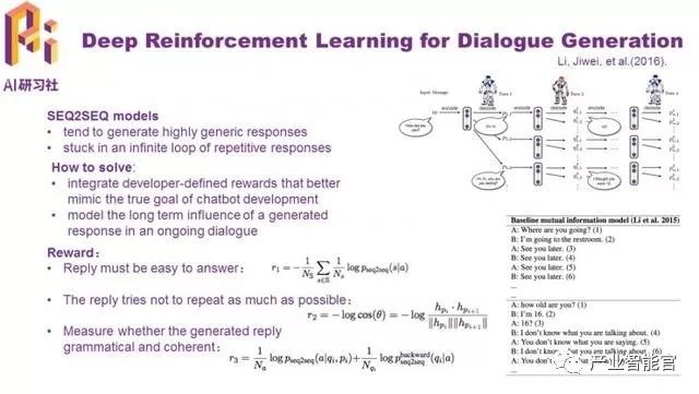 这篇论文的内容是,用强化学习去解决对话生成的一个问题。对话生成的主要问题是,会生成一个很一般的一个回答,比如「see you later」这种很没有营养的一种回答。另外,它会形成一个循环,就是「see you later」「see you later」「see you later」这种,这篇论文的作者是李博士,他在对话生成方面发表过不少好的论文,大家也可以去看一下。