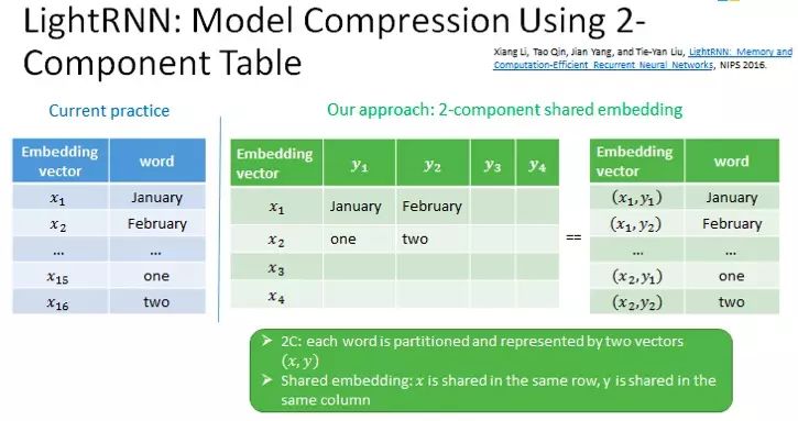 我们的算法的基本思想是:不是用一个向量来表达一个词,而是用两个向量表达一个词,一个行向量+一个列向量,不同的词之间共享行或列向量。我们用一个二维的表格来表达整个词表,假设这个二维的表格有一千行一千列,这个表格可以表达一百万个词;这个表格的每一行有一个行向量,每一列有一个列向量,这样整个二维表格只需要两千个向量。如果一个词(January)在第一行第一列的话,它就由行向量X1和列向量Y1来联合表达。考虑一个有一百万个词的词表,原来需要一百万个嵌入向量,通过这样一个二维或者是两个component的表格词嵌入,现在我们只需要一千个行向量和一千个列向量来进行表达,这样大大降低词嵌入向量模型的大小。