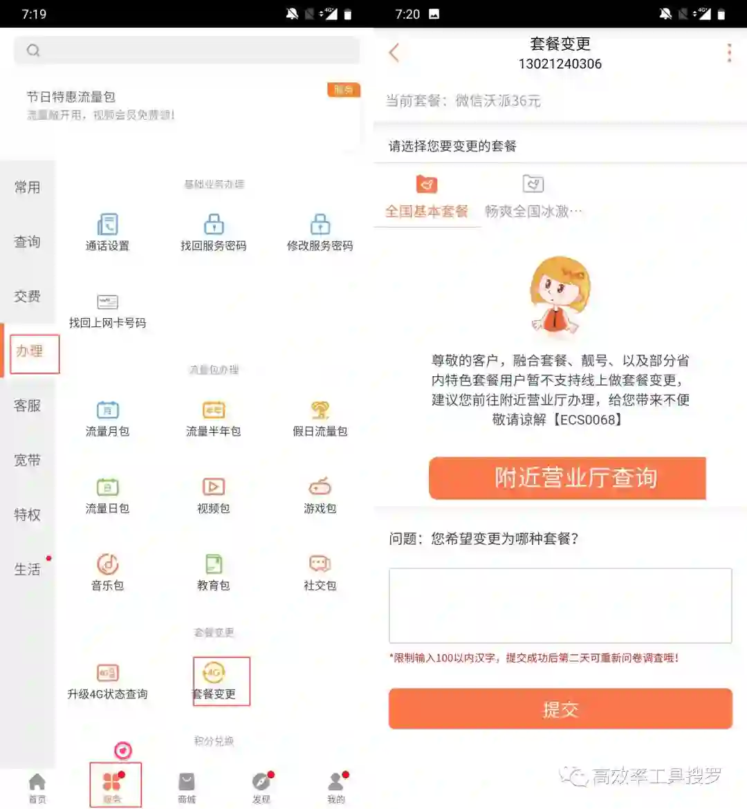 现在使用这个App 就可以自助更换套餐了,点击【服务】 --> 【办理】--> 【套餐更改】,然后就可以选择你自己的套餐了。
