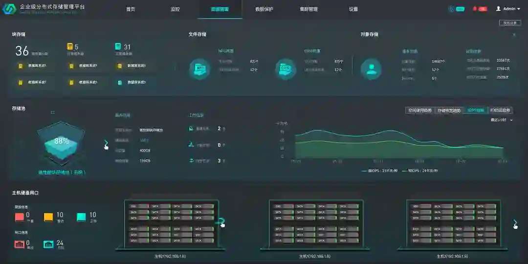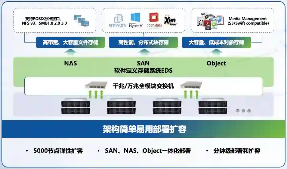 深信服企业级分布式存储aStor-EDS采用全对称分布式架构,支持数千节点集群部署,灵活扩展的同时保持更高的性能,最大可扩展EB级存储空间、1,000万IOPS高性能支撑,实现了一套硬件资源池上,可同时提供块、文件、对象三种存储服务。