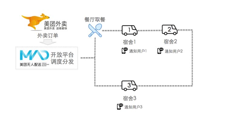 美团无人配送团队在上海松江大学城做了试验。这个占地 8000 亩的园区集中了七所高校,由于前期规划,这个半开放区域交通路线相对简单,便于设计无人配送固定路线。餐饮商铺大多开在街边而非商城里,大学生集中住在没有电梯的公寓楼,无人配送车从商户取餐时候不需要进楼,配送时也不需上楼,可以发短信要求学生下楼自取。大多数情况下一款车可以走完第二、三段路,不需要室内车和室外车配合,降低了配送难度。