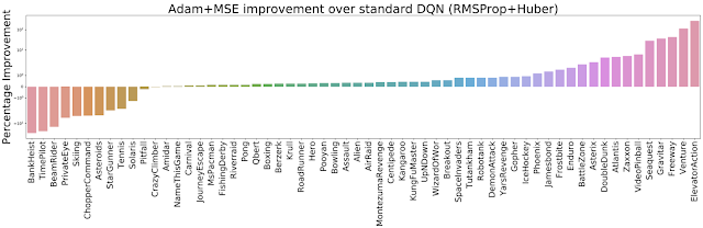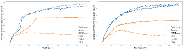 因此,研究者将两个优化器(RMSProp、Adam 优化器)与两个损失函数(Huber、MSE 损失)进行了不同的组合,并在整个 ALE 平台(包含 60 款 Atari 2600 游戏)上进行了评估。结果发现 Adam+MSE 组合优于 RMSProp+Huber 组合。