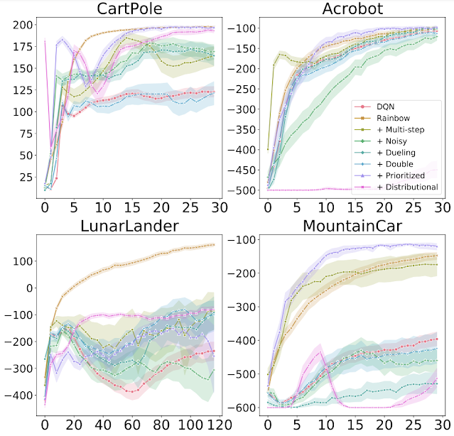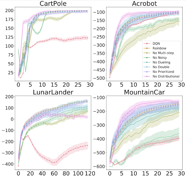 上图显示了在 4 个经典控制环境中,从 Rainbow 中移除各种组件时的训练进度。x 轴为训练 step,y 轴为性能(越高越好)。