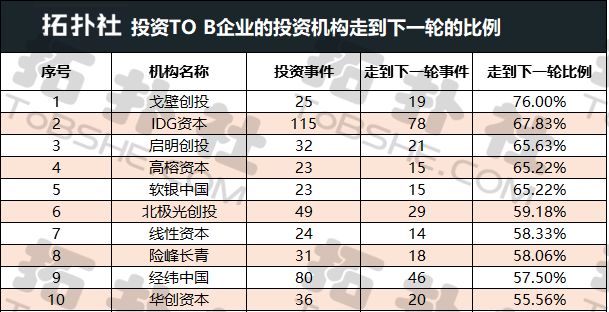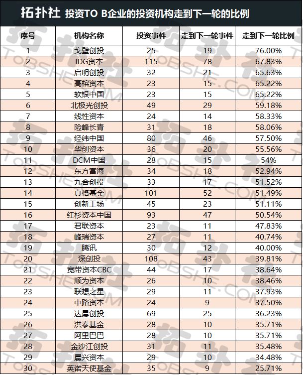 通过盘点投资机构在企业服务方向所投企业走到下一轮的比例,拓扑社(ID:tobshe)排列出了 To B 领域投资机构的前 30 强,并对其中具有代表性的机构的分析,从而让我们发现,哪些投资机构最能慧眼识英才。