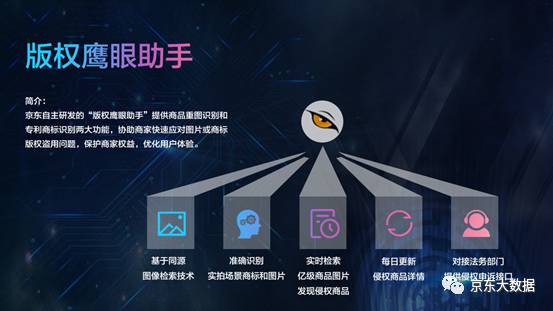 版权鹰眼助手:京东自主研发的“版权鹰眼助手”,提供商品重图识别和专利商标识别两大功能,协助商家快速应对图片或商标版权盗用问题,保护商家权益,优化用户体验。