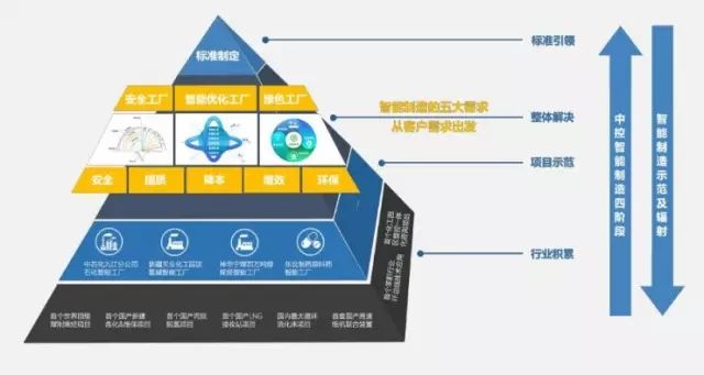 往下看的话,针对我们的智能制造有四个示范项目,这是国家工信部立的四个项目。再往下是我们20多年的行业积累,这个是倒着从上往下看的,其实如果从下往上看,这是我们智能制造中控的四个阶段,最底下是解决我们单个企业用户的,最后我们拿出来一个整体解决方案,包括最后要制定标准,因为企业做到一定程度,你需要把这个东西标准化,那么中控参与了很多国际标准的制定。